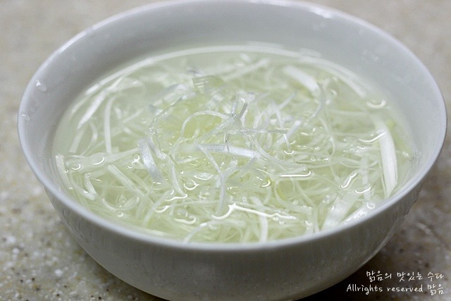 대파는 윗쪽 흰부분만을 얇게 채썰어 냉수에 담근후,,, 양등
